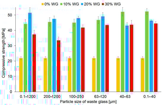 The compression strength of geopolymers depending on the share and particle size of the waste glass addition was demonstrated in Figure 9. The compressive strength of the geopolymers increased after the incorporation of waste glass into the matrix by 53% to 137%, depending on the composition of the samples. Similar results were obtained by Jiang et al. [46], who explained that glass contains SiO2 and Al2O3, which can react and form aluminosilicate hydrates, which have a positive influence on compressive strength.