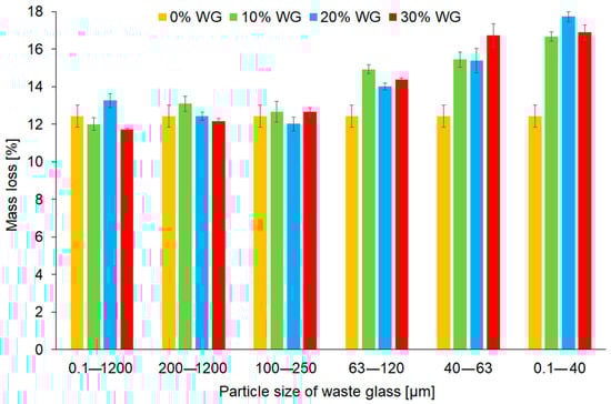 Mass loss of the geopolymers depending on the share and the fraction of waste glass particle size after the fire resistance test.