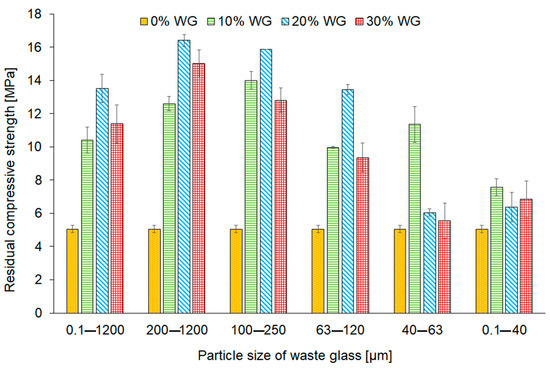 Moreover, on the basis of the results, it was observed that the application of waste containing fractions with the highest particles (200–1200 μm) and (0.1–1200 μm) caused the increase in residual compressive strength by about 221.6% and 164.7% as compared to the reference geopolymer. Considering future industrial applications, it should be noted that the sieving and dispensing of waste glass are associated with high costs and there is a necessity to use additional technological solutions. Therefore, the results obtained for geopolymers with the additive of unsorted waste glass are the most promising.