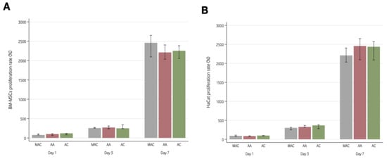 Proliferation rate of HaCats (A) and BM-MSCs (B) for the three groups: machined (MAC), anodization for dental abutments (AA), and anodization for implant collar (AC). Data expressed as median and interquartile range. BM-MSCs: Mouse bone marrow-derived mesenchymal stem cells; HaCats: Immortalized human keratinocytes.