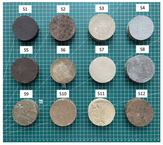 The experimental tests were carried out on twelve soil samples taken from different depths and geographical positions, all near the site of the ongoing construction activities. The sampling approach was designed to acquire a comprehensive representation of the soil profile in the vicinity of the work site, thereby providing valuable insights into the soil characteristics and evaluating the possibility of using them to construct rammed-earth walls. For easier identification, each soil sample has been individually coded as follows: S (soil) + extraction location number (1–12), resulting in the 12 identification codes of the 12 soil types analysed, i.e., S1–S12. Additionally, for the purpose of individual sample identification, Table 2 shows the extraction depths of each of the 12 soil samples analysed. The test samples were taken in 70 mm-diameter punches, as shown in Figure 1.