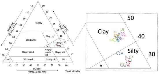 For the analysed natural soils, the particle size classification was carried out by using the ternary diagram, which represents on the axes the granular fractions from SR EN ISO 14688-1 [56]. The results of the particle size determination showed that the analysed samples are delimited into two categories of soils: clay with a mainly clay fraction (S1, S3, S4, S6, S7, S9, and S10) and silty clay with a preponderant silty fraction (S2, S5, S8, S11, and S12), as illustrated in Figure 2.