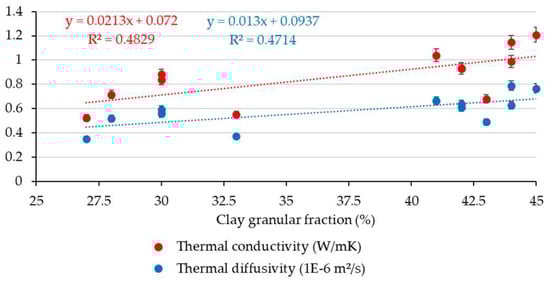 Based on the results obtained from the measurements of thermophysical characteristics, a comparative synthetic assessment was carried out to estimate the existence or level of correlation with the soil geotechnical parameters. For this purpose, a series of data analyses have been performed by considering the clay content fraction, plasticity index, and density of the soils. The variability of thermal conductivity and diffusivity parameters with the clay content fraction is presented in Figure 3. It indicates a relative correlation between these parameters, as it was observed that an increase in clay can lead to an increase in thermophysical data, which reflected that the increase in clay fraction should be considered a potential variable for positive changes in thermophysical parameters. Moreover, a simple correlation analysis for this set of parameters was also performed. The results of the statistical analysis show moderately positive correlations between the selected sets of data, where the correlation coefficient (R2) is around 0.50, as shown in Figure 4, with similar trends for both thermophysical parameters. Although the possibility of identifying a potential correlation of thermal performances based on the clay fraction was examined, defined not by a linear function but by a polynomial, logarithmic, or other type of function, the correlation factor, R2, did not indicate a strong correlation in these situations. It consistently showed low values, suggesting that these parameters are strongly influenced by a variety of other variables. A similar approach was made by analysing the variability of thermophysical measurements with the plasticity index data, as seen in Figure 5. The results of the statistical analysis highlighted that there is no correlation between the analysed characteristics. The data analysis also showed that the thermal conductivity and thermal diffusivity generally increase with the increase in soil density, which suggests the potential for denser material with closer molecules to have a high thermal conductivity, as illustrated in Figure 6. Furthermore, extending this analysis of the data in terms of correlating geotechnical and thermophysical parameters, the specific heat capacity of soil samples is negatively correlated with density, whereas thermal conductivity is positively correlated with density. A moderate to slightly strong relationship was identified between density and thermophysical data, with a correlation coefficient (R2) around 0.70, as seen in Figure 7. While the correlation of these two sets of indicators—density to thermal conductivity and density to thermal diffusivity—is characterised by a better correlation index (R2) than when analysing correlation based on clay fraction (R2 > 0.6), it can also be appreciated that density is not the only decisive factor in the evolution of thermophysical indicators. Moreover, even changing the modelling function from linear to polynomial does not lead to a substantial improvement in the correlation index, which remains below 0.75.
