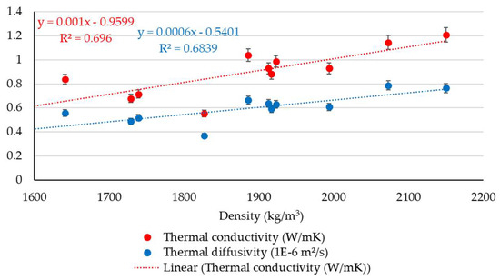 - Overall, it can be said that there is a high degree of heterogeneity in terms of the thermophysical characteristics of these materials, and no mathematical correlation can be identified that indicates with sufficient precision (R2 > 0.9) the variation in one of these characteristics in relation to another, probably as a result of compositional, mineralogical, and grain size differences. In fact, this is the main difficulty encountered whenever the subject of rammed earth wall construction is discussed: the heterogeneity of the raw material and the need to characterise it from a thermophysical point of view.