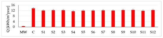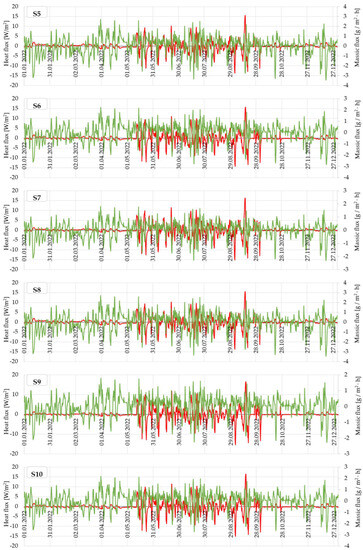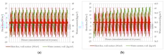 Figure 8a illustrates the 16-year evolution of heat flux at the interface between the air and the wall surface, as well as the total water content within the thermodynamic contour (spanning from the wall surface to the wall’s symmetry axis). The results are those obtained using WUFI® 2D 4.2 with the thermal characteristics of sample S1, as an example. However, similar patterns were observed for all the clay-based materials (S1–S12).
