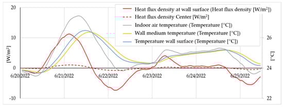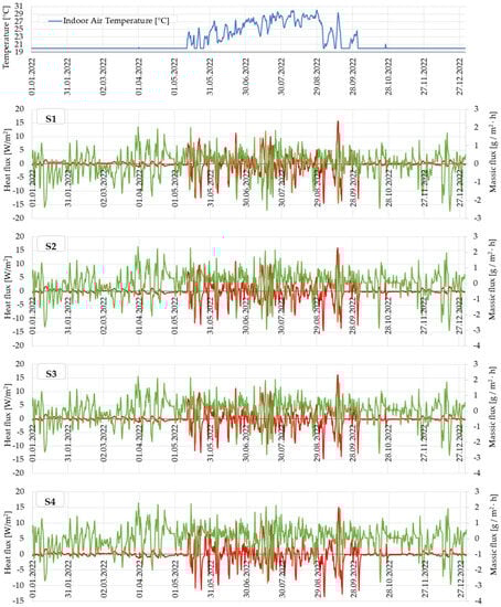 Refining the analysis period to the final year, the 16th, when essentially the entire process had reached a stable state, Figure 9 presents the records for all analysed materials. The heat transfer between the wall and the interior environment during winter is quite interesting, especially as the indoor temperature is consistently held at 20 °C. This fact can be attributed to the fluctuations in air humidity and the buffer effect created by the wall. Interestingly, this effect allows the enthalpic transfer of the interior wall to occur throughout the year, not just during the warm season as initially anticipated. Of course, during the warm season when the interior space is not air-conditioned, the interior wall experiences a higher degree of thermal stress and thermal flux. However, it is important to note that the transfer of heat and mass is a year-round process.