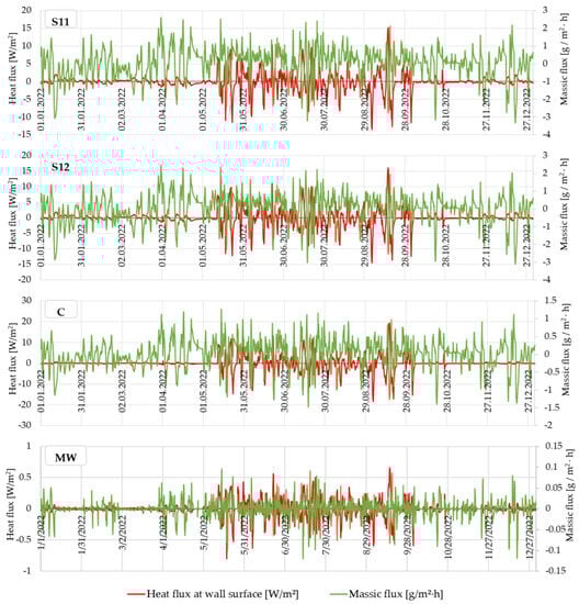 Evolution of the heat flux at the wall surface and the massic flux, respectively, for a thermodynamic contour between the face of the wall and its vertical axis of symmetry with a surface of 1 m2, over the last year of simulation, for a rammed earth wall made of clay materials (S1–S12), concrete (C), and a classic drywall with a mineral wool core (MW).