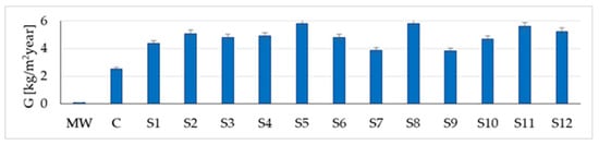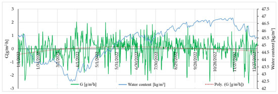 Analysing the evolution of the mass flow (G) and the water content of the wall over the course of a year (from 1 January to 27 December of the 16th year of the simulated period), it was shown that the variation in the mass flow corresponds to a polynomial function that serves only as a wrapper (a synthesis) of the mass flow’s variation. This is exemplified by a rammed earth wall made from material S1 in Figure 10. This polynomial function intersects the X-axis at a certain point in March, transitioning from a domain of negative values to positive ones, therefore transitioning from an interval of drying (the wall has a negative derivative of water content with respect to time since the beginning of the year) to another interval in which there is an increase in the wall’s humidity. This occurrence, taking place in March, unfolds under the influence of increasing air humidity, which is in line with the general climatic evolution. This increase consequently leads to a rise in the humidity of the indoor air, prompting the wall to start accumulating moisture. During the summer, there are observable instances of momentary humidity fluctuations. For instance, on 17 July, the wall releases a significant amount of moisture as the relative humidity of the indoor air is quite low, but overall, the wall tends to accumulate moisture in the warm interval. The mass accumulation persists until around 10 October, when the envelope function intersects the X-axis once again. This time, it transitions into the domain of negative values, meaning that water exits the thermodynamical contour and vapours are released into the indoor air. This coincides with the seasonal drop in outside temperatures in the autumn and the initiation of the indoor heating system. It is also noted that during the winter, if the indoor air humidity significantly increases, some of this humidity is absorbed by the wall. In exchange, the wall releases a thermal flux towards the interior. For all other samples analysed, S2–S12, the general trend is similar. The only variation is the precise timing within the year when the X-axis intersects with the graphical representation of the envelope functions corresponding to each case. However, the months in which the two key events occur, namely March and October, remain consistent. This could serve as an indicator of the operational capacity of rammed earth walls as a buffer for controlling the temperature and humidity of an indoor space.