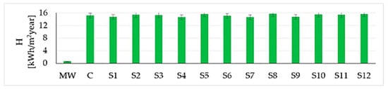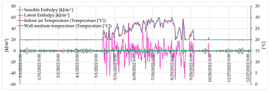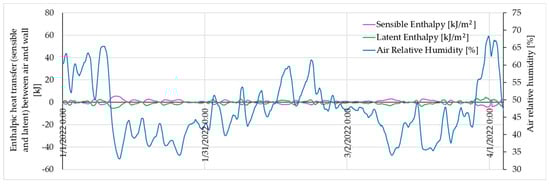 - To analyse the overall performance of interior walls made from various construction materials, the global parameter of enthalpy is integrated over the thermodynamic boundary using the data provided by WUFI® 2D 4.2 for the last year of the simulation. This corresponds to a volume defined from the interface of the wall with the indoor air to the axis of symmetry of the wall, with an area of 1 m2 (Equation (5)):where H represents total enthalpy exchange per square metre of wall surface [J/m2], the first term is the total heat flow through wall surface over the analysed yearly interval (both inside the thermodynamic volume and through the exterior), q(t) represents the heat flow integrated over one hour [Wh/m2], and the second term represents the latent component of enthalpy, with g(t) being the mass flow integrated over one hour [g/m2]. For the latent heat of water vaporisation (Lv), a value of 2.257 kJ/g was used.