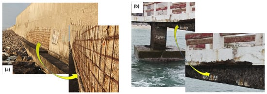The installation of seawater reverse osmosis (SWRO) plants is increasing to supply fresh water used by communities and for mineral processing, chemical industries, and, recently, green hydrogen production [1]. The corrosion of reinforcing steel exposed to seawater has received significant attention due to its widespread use in industrial and social infrastructures [2,3,4,5]. Multiple studies have demonstrated that corrosion initiation is a stochastic process that starts at random sites on steel surfaces and is highly susceptible to the concentration of chloride ions present in the solution [6,7,8,9]. Additionally, the service life of reinforced steels exposed to marine environments is affected by factors such as the infiltration of chloride and sulfate ions via diffusion or other mechanisms into the carbon steels [10,11]; the reaction between carbon dioxide and calcium hydroxide products of cement hydration, which generates calcium carbonate [9,10,11,12]; and unsatisfactory depth cover or excessive porosity in the concrete, which increases the risk of the penetration of gases and aggressive ions into the concrete [13,14,15,16,17]. Furthermore, other factors that affect the corrosion rate include the heterogeneity of the concrete and the type of carbon steel [18], the pH of the concrete pore water, the carbonation of the cement paste, the presence of cracks in the concrete, and galvanic effects due to contact between dissimilar metals [19,20,21]. These factors promote the corrosion of the steel–concrete interface, reducing the service life of the structure [6,22,23,24,25]. Figure 1 shows examples of buildings on the coast of Iquique, Chile, that have not been in operation for more than 10 years and have visual corrosion damage on the walls, slab foundation (Figure 1a), and at the bottom of the bridge (Figure 1b). These damages are associated with failures in the concrete, where cracks and detachments lead to the reinforced steel being directly exposed to the seawater, which is later corroded and accelerated by the high chloride ion content in the seawater.