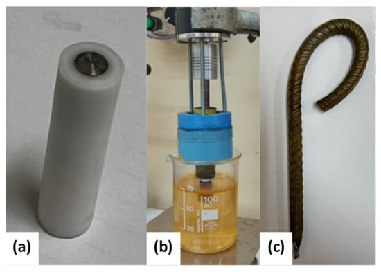 - Electrodes to simulate mechanical stress conditions: The electrodes were fabricated using a 160 mm long and 6 mm diameter bar. The upper parts of these electrodes were bent to simulate the mechanical stress conditions experienced by construction bars (Figure 2c). The curved electrodes were exposed to the test solution for 288 h under OCP and stationary hydrodynamic conditions. Several LSV measurements were conducted during this period.