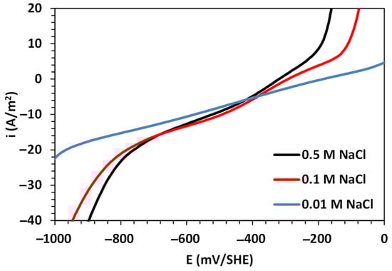 From the results shown in Figure 3, it is evident that the concentration of sodium chloride has a strong influence on the electrochemical response. The dissimilarity of the results is mainly reflected in the increased Tafel slope for both the cathodic and anodic branches, as well as the shifting of the corrosion potential () in the cathodic direction. On the one hand, these shifts in values are related to the variations in the physical properties of the test solution, which promote lower oxygen solubility with an increase in solution salinity. On the other hand, the increases in the anodic and cathodic branches with the sodium chloride concentration are related to the high activity of chloride ions and their diffusion on the metallic surface. This leads to an increase in the kinetics of the IOR and ORR, ultimately promoting high corrosion rates.