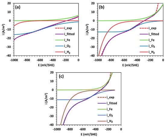 Deconstruction of polarization curves by applying mixed potential theory for A630-420H steel in contact with saline solutions: (a) 0.01 M NaCl, (b) 0.1 M NaCl, and (c) 0.5 M NaCl.