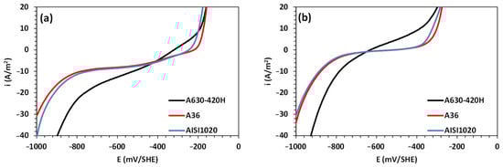In the context of the corrosion behavior of steel, a comparative analysis of the corrosion behavior was performed for steel samples of types A36, AISI 1020, and A630-420H in an aerated and de-aerated 0.5 M NaCl solution, as shown in Figure 5. The oxygen content in the solution was purged with nitrogen for the measurements in the de-aerated solution. The results indicate similar electrochemical responses for AISI 1020 and A36 steels, contrasting with A630-420H, which shows significant differences in the cathodic branch and the region close to the inversion potential. Additionally, in both aerated and de-aerated solutions, the polarization curves reveal higher anodic and cathodic activities for the reinforced A630-420H steel, indicating a higher corrosion rate. This difference in corrosion rates can be attributed to the chemical composition of A630-420H steel, particularly its carbon and silicon content. The high carbon content promotes the presence of the perlite phase, leading to the formation of galvanic cells between the ferrite and cementite phases, thus increasing the corrosion rate. Furthermore, the addition of silicon promotes the formation of a denser and more compact corrosion products layer, which in turn limits the diffusion of aggressive ions on the metallic surface [36,37].