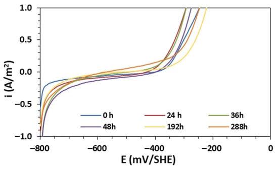 In these experiments, the corrosion of a bent A630-420H electrode immersed in an aerated 0.5 M NaCl solution for 288 h under OCP and stagnant hydrodynamic conditions was investigated. Figure 7 illustrates the electrochemical measurements of the electrode over time, which were recorded using linear sweep voltammetry to gain a better understanding of the action of the corrosion products formed on the metallic surface.