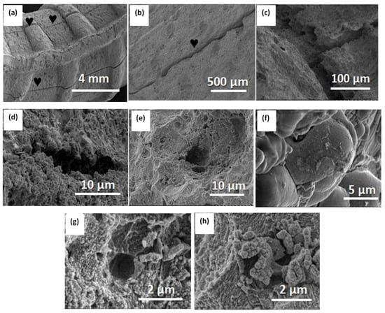 SEM images of corroded A630-420H steel after 288 h of immersion in 0.5 M NaCl solution with formation of (a–d) cracks and (e–h) pore sites.