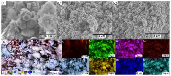 SEM images of the corrosion products formed on the A630-420H steel surface after 288 h of immersion in 0.5 M NaCl solution, (a) magnification of 70,000×, (b) magnification of 20,000×, (c) magnification of 10,000×, and (d) elemental mapping of the corrosion products at magnification of 1999×.
