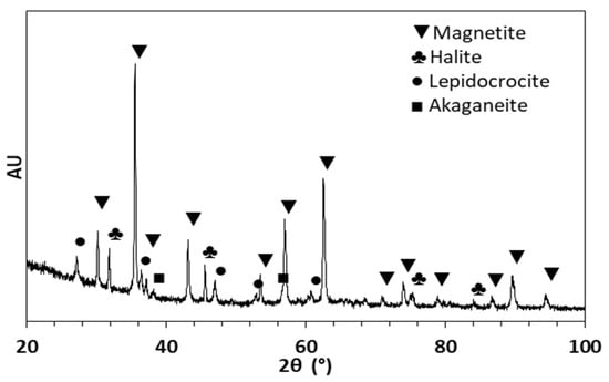 The XRD results provide evidence of well-known patterns attributed to oxides such as Fe3O4 (magnetite) and oxyhydroxides such as γ-FeOOH (lepidocrocite) and β-FeOOH (akaganeite). The presence of the akaganeite phase indicates the transformation of a previous green rust phase [Fe32+Fe3+(OH)8]+[Cl·nH2O]− (hydroxychloride) into akaganeite due to the prolonged exposure times of the sample in a high-chloride-concentration solution [39]. Additionally, the presence of the magnetite phase is consistent with the polarization curves, such that a decrease in the dissolved oxygen near the metallic surface leads to a low-oxygen-concentration environment in which magnetite remains stable [32]. Lastly, the halite (NaCl) phase is attributed to the drying process of the sample and the crystallization of the aqueous NaCl present in the test solution.