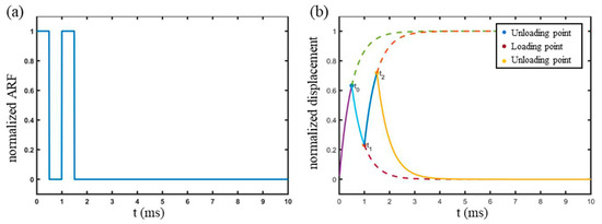Schematic diagram of the double ARF impulse loading process. (a) Normalized ARF impulses with loading and unloading durations of 0.5 ms for each impulse. (b) Normalized displacement response of a soft tissue sample.