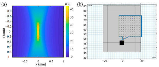 (a) Sound pressure distribution in the focus range of 1 mm × 1 mm; (b) FEM model with the ARF applied.