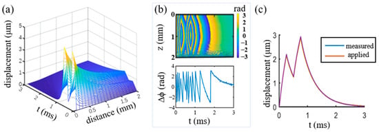Finite element modeling of ARF excitation and displacement measurement by OCE. (a) Spatial and temporal distribution of the displacement distribution in the excitation region; (b) the phase shift distribution caused by the displacements in (a) according to OCE (upper figure), and the phase distribution at 1 mm depth (the lower figure); (c) comparison of the displacement curves of the applied and measured by OCE virtually.