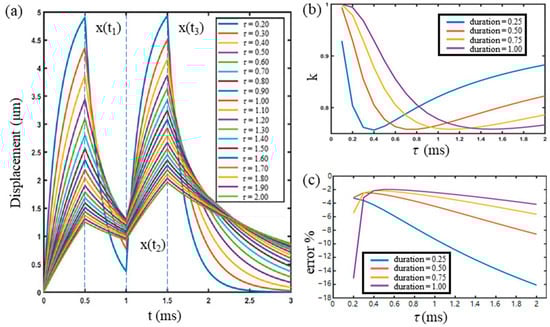 (a) Curves of displacement changing with time for specimens with different viscosities, when the duration of each ARF loading impulse is 0.5 ms. The unit of τ on the figure is ms; (b) curve of the increase rate k versus for different loading duration; (c) relative measurement error of for different loading duration.