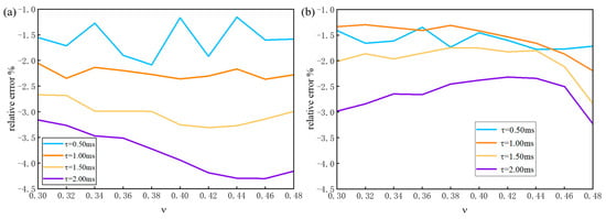 Changes of the relative measurement error versus the Poisson’s ratio and relaxation time constant, . (a) Error curves of material with elasticity ; (b) error curves of material with elasticity .