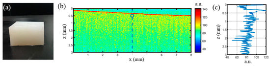 OCT imaging of a phantom. (a) A photo of one of the phantoms. (b) An OCT B-mode image of the specimen; (c) an OCT M-Mode image along the dashed line in (b).