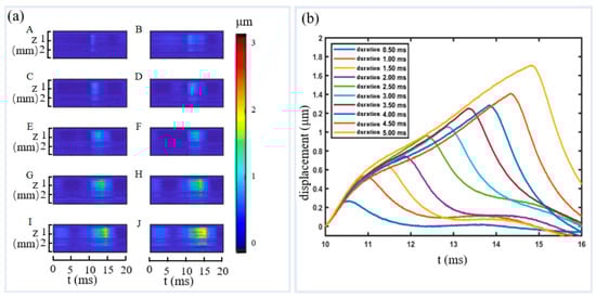 Displacements generated by different duration of ARF and measured by OCT. (a) OCT maps of the specimen under different duration of excitation. (b) Changes of displacements at the focal point versus time.