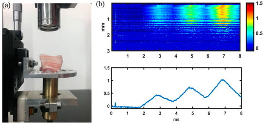 A pork specimen with 5 cm × 5 cm × 3 cm in length, width and height was measured at room temperature. The specimen was cut from a piece of pork meat bought from a supermarket in China. The experiment was conducted right after the meat was bought, without any preserving time. A similar procedure to the phantom measurement was carried out. It took less than 1 min to complete the test, thus no hydration was applied. A setup of the sample with the ultrasound transducer fixed underneath it and the OCT scanning lens aligned on the top is shown in Figure 12a. Prior to the test, OCT B-mode imaging was carried out to find a homogeneous region for viscosity measurement. The sample was also loaded by three ARF impulses and the displacement distribution is shown in Figure 12b. From the top figure, it can be seen that reasonable data are obtained within the 1 mm depth near the surface, due to the penetration limitation of OCT imaging. From the displacements induced by the ARF impulses, the τ of the pork meat is obtained. The experiment was repeated at three different regions. The average value of τ was measured to be 6.2 ± 0.03 ms, which is in the range of pork meat measured by nuclear magnetic resonance technique [].