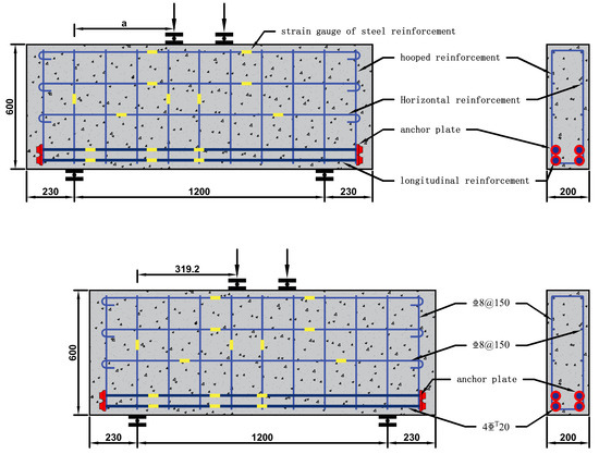Previous studies have shown that the shear span ratio is one of the important influencing factors on deep-beam components [11]. Tan et al. [12] proposed that the shear span ratio affects the failure mode of deep flexural members by reflecting the distribution of shear force and bending moment. Oh and Shin [13] proposed that the ultimate shear capacity of the component is controlled by the shear span ratio regardless of the strength of the concrete. Chen et al. [14] found that the shear capacity of steel-reinforced concrete deep beams decreased with the increase in shear span ratio. Jin [15] found that the shear span ratio had a great influence on the shear strength of the beam. The smaller the shear span ratio, the higher the shear strength of the deep beam. Tan et al. [16] analyzed the effect of web reinforcement on the shear behavior of deep beams. It is considered that when the shear span ratio is greater than 1, the improvement of the shear bearing capacity of stirrup reinforcement is more significant than that of horizontal reinforcement. When the horizontal and stirrup reinforcement are configured at the same time, the influence on the shear bearing capacity of deep flexural members is the most significant. At the same time, web reinforcement can effectively control the development of oblique cracks. Singh, et al. [17] found that by increasing the horizontal reinforcement ratio, the strut coefficient of ordinary strength and high-strength concrete increased by 31% and 25%, respectively. However, for higher reinforcement ratios, the increase in the strut coefficient was relatively small. Mihaylov et al. [18] found that stirrups increased the shear capacity by increasing the height of the top compression zone. Chinese code [19] also proposes that when the shear span ratio is large, the influence of web reinforcement is more obvious. With the decrease of span–depth ratio, the shear force of members changes from being mainly borne by stirrup reinforcement to only being borne by horizontal reinforcement. Regarding the influence of longitudinal reinforcement on deep-beam components, Tan et al. [12] found that when the shear span ratio was less than 1.5, the longitudinal reinforcement ratio had a significant impact on the shear bearing capacity of deep bending components. Liu et al. [20] found, through experiments, that as the reinforcement ratio increased, the shear bearing capacity of the component increased linearly, and this effect was obvious when the shear span ratio and span height ratio were small. Shi et al. [21] found that the anchor plate can give full play to the yield performance of the steel bar, so that the beam with the anchor plate has a larger influence area on the compression bar and improves the shear capacity of the component. Miao [22] and Sim [23] found the failure mode and bearing-capacity calculation method of steel bars with anchor plates. This fully demonstrated that the anchor plate can be used for anchoring deep beams and is beneficial for improving the shear bearing capacity of deep beams.