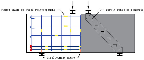The main data collected during the loading process are as follows: (1) deflection: three displacement meters were arranged at the middle position of the bearing and the bottom of the beam to measure the vertical displacement of the specimen; (2) characteristic load: including normal section cracking load, inclined-section cracking load and ultimate load; (3) concrete strain: oblique and vertical strain gauges were arranged evenly on both sides of the specimen and the vertical part of the beam span to measure the concrete strain; (4) longitudinal reinforcement strain: strain gauges were arranged at equal intervals on the bottom longitudinal reinforcement to measure the strain of the bottom longitudinal reinforcement and clarify the effect of the longitudinal reinforcement; (5) strain of web reinforcement: strain gauges were arranged at equal intervals on the web reinforcement in the shear span area to measure the strain of web reinforcement and clarify the shear resistance of web reinforcement; and (6) crack width development: the occurrence of cracks and the width of existing cracks were recorded after each stage of loading. The arrangement of displacement meters and strain gauges on the specimen is shown in Figure 5.