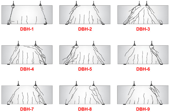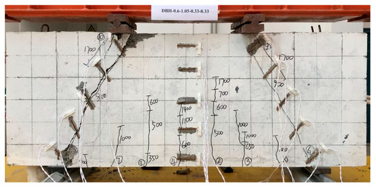 Taking the specimen DBH-2 as an example, the specimen showed a typical failure mode as a control specimen, as shown in Figure 6. From the Figure 6, it can be seen that the failure surface was located in the concrete strut at the connection between the left support and the backing plate, and was a diagonal compression failure in the form of concrete-strut crushing.