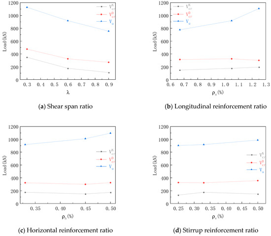 The characteristic load curve of Figure 8 shows that the cracking load of the normal section was about 15–20% of the ultimate load except Group a of specimens, and had no obvious correlation with the reinforcement ratio of the steel bar. The reason for this was that the load of the specimen was mainly borne by the concrete part and the steel bar did not bear a load, or the load was small. The / of Group a decreased with the increase in shear span ratio. The reason for this was that the increase in shear span ratio meant that the specimen as subjected to an obvious bending effect, which was more likely to produce bending cracks.
