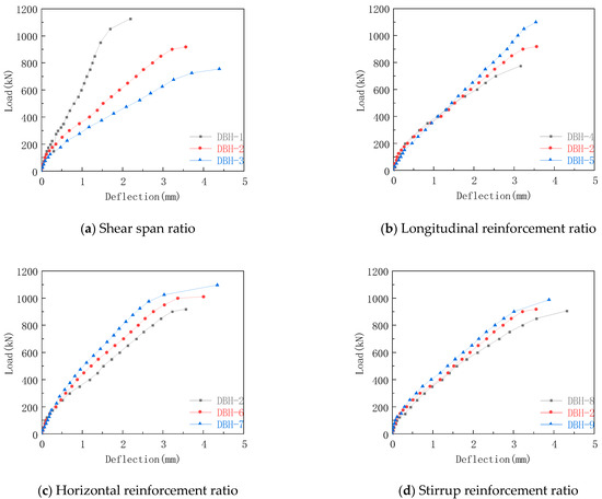 From Figure 9a, it can be concluded that the deflection increased with the increase in shear span ratio. When the shear span ratio was 0.3, 0.6, and 0.9, the maximum mid-span deflection was 2.19 mm, 3.56 mm, and 4.39 mm, respectively. This is because as the shear span ratio increased, the failure mode of the specimen gradually changed to bending failure, and the number and width of cracks at the bottom of the mid-span increased, which eventually led to faster release of internal energy and a significant reduction in stiffness, resulting in an increase in mid-span deflection. From Figure 9b, it can be seen that the deflection dd not show significant difference when the load was below 500kN. after that, the deflection decrease slightly with the increase in the longitudinal reinforcement ratio at the bottom. When the longitudinal reinforcement ratio was 0.67%, 1.05%, and 1.25%, the maximum mid-span deflection was 3.16 mm, 3.56 mm, and 3.55 mm, respectively. This was due to the development of the height and width of the crack. The bottom longitudinal reinforcement began to participate in the force to form a tie rod. The increase in the reinforcement ratio of the bottom longitudinal reinforcement increased the stiffness of the specimen and increased the bending resistance of the specimen so that the mid-span deflection was reduced. However, the bottom longitudinal reinforcement did not yield when the specimen reached the ultimate load, and did not give full play to its role, so the maximum mid-span deflection was similar. Comparing Figure 9c,d, when the horizontal reinforcement ratio was 0.33%, 0.45%, and 0.50%, the maximum mid-span deflection was 3.56 mm, 4.01 mm, and 4.35 mm, respectively. When the stirrup reinforcement ratio was 0.25%, 0.33%, and 0.50%, the maximum mid-span deflection was 4.31 mm, 3.56 mm, and 3.88 mm, respectively. Although the change of web reinforcement ratio can limit the development of inclined cracks, it had no obvious effect on the bending resistance of the specimen. Therefore, the change of web reinforcement ratio had no obvious effect on the maximum mid-span deflection of the specimen.