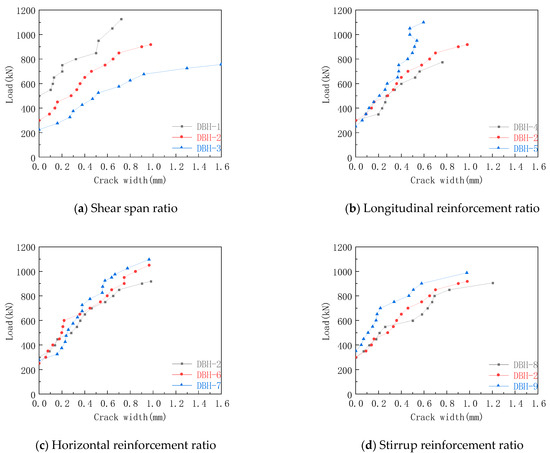 The crack-width curve of each group of oblique sections in the experiment is shown in Figure 10. It can be seen from Figure 10a that with the increase in shear span ratio, the earlier the crack appeared, the larger the crack width, and the lower the slope of the curve. When the shear span ratio was 0.3, 0.6, and 0.9, the maximum width of the inclined-section crack was 0.72 mm, 0.98 mm, and 1.60 mm, respectively. The reason for this was that the decrease of the inclination angle of the compression bar changed the stress distributed on the compression bar and the tension bar. The compressive stress at the support decreased, and the tensile stress of the tie bar increased. The specimen was subjected to bending, and it was difficult to resist the emergence and development of cracks. It can be seen from Figure 10b that the longitudinal reinforcement had little effect on the crack width when the load was small. When the load was large, the crack width decreased with the increase in the longitudinal reinforcement ratio. When the longitudinal reinforcement ratio was 0.67%, 1.05%, and 1.25%, the maximum crack widths of the inclined sections were 0.76 mm, 0.98 mm, and 0.60 mm, respectively. After the formation of inclined cracks, the deep-beam members gradually formed an STM system with longitudinal reinforcement as the tie bar and concrete between the loading plate and the supporting plate as the compression bar. In particular, the longitudinal reinforcement at the support limited the development of inclined cracks by pinning action. The increase in longitudinal reinforcement led to the decrease of diagonal crack width, which enhanced the interlocking effect of aggregate, thus improving the shear capacity of deep beams. It can be seen from Figure 10c,d that when the horizontal reinforcement ratio was 0.33%, 0.45%, and 0.50%, the maximum width of inclined-section cracks is 0.98 mm, 0.97 mm and 0.97 mm, respectively. When the stirrup reinforcement ratio was 0.25%, 0.33%, and 0.50%, and the maximum width of the oblique section crack was 1.22 mm, 0.98 mm, and 0.98 mm, respectively. The reinforcement skeleton formed by the web reinforcement could effectively constrain the strain of the concrete, thereby reducing the crack width. The reason for the unobvious difference in the early stage of Figure 10c is that the extension height of the crack in the early stage was low, and the number of horizontal reinforcements passing through the crack was small. In the later stage of loading, the crack was fully developed, and more horizontal reinforcements participated in the tensile strength. Therefore, increasing the horizontal reinforcement ratio helped to reduce the crack width, which is consistent with Tan et al. [41] that if the horizontal and stirrup reinforcement are distributed at the same time, it has a better limiting effect on the development of oblique cracks in deep beams.