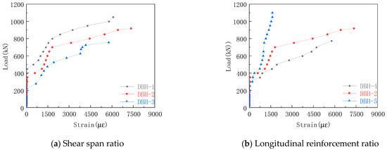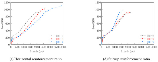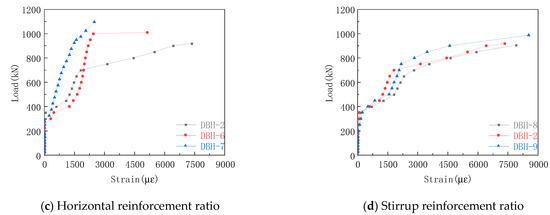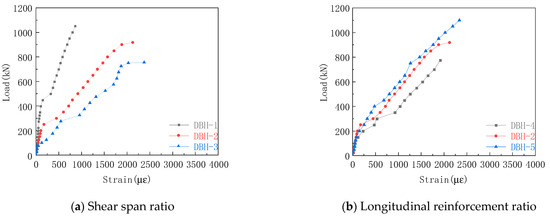The longitudinal reinforcement strain curve of each group in the experiment is shown in Figure 11. The strain of the longitudinal reinforcement was small before the cracking of the specimen, and the strain increased rapidly after the cracking, and there was a clear slope downward trend. The stress mechanism of the tie rod arch was formed inside the specimen. The longitudinal reinforcement acted as a tie rod, and the strain increase with the increase in the load, indicating the validity of the STM. It can be seen from Figure 11a that the increase in shear span ratio made the strain of longitudinal reinforcement at the bottom increase obviously. This was because the tie rod bore more tension, and the failure mode changed from bending shear failure to bending failure. Therefore, when the shear span ratio is small, the reinforcement ratio of longitudinal reinforcement can be appropriately reduced to achieve better economic benefits. It can be seen from Figure 11b that with the increase in longitudinal reinforcement ratio, the strain of longitudinal reinforcement decreased under the same load. The reason for this was that the increase in the longitudinal reinforcement ratio made the cross-sectional area of the tie rod large, resulting in the decrease of the longitudinal reinforcement strain. From Figure 11c,d, it can be seen that the increase in horizontal reinforcement ratio increased the strain of longitudinal reinforcement, and the stirrup reinforcement ratio had little effect on the strain of longitudinal reinforcement. The reason was that the horizontal reinforcement could effectively constrain the transverse strain of concrete, so that the strain of longitudinal reinforcement and the strain of bottom concrete tended to be consistent, and the stirrup had no effect on the constraint transverse strain. Therefore, increasing the horizontal reinforcement ratio can give full play to the role of longitudinal reinforcement.