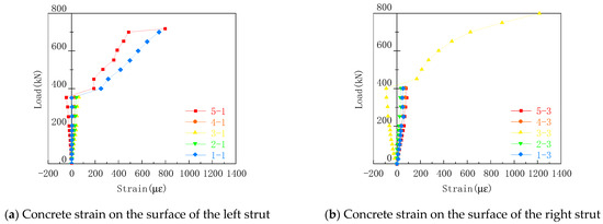 The specimen DBH-2 is taken as an example, as shown in Figure 13. Before cracking, the concrete was in the elastic stage, the concrete strain was basically linear, and the concrete on both sides was in a state of compression, which conformed to the characteristics of the strut bar in the STM. After cracking, the strain of concrete increased rapidly, and some strain gauges were torn due to concrete spalling. There was no large crack in the concrete strut on the other side, and the strain continued to increase, which is consistent with the oblique compression failure of the strut crushing.