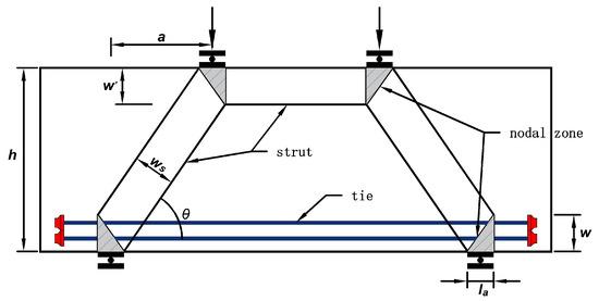 Deep beams are generally used as transfer components at discontinuous vertical loads in buildings and bridge structures. The stress mechanism of deep beams is complex and there are many factors affecting the bearing capacity, such as compressive strength of concrete, shear span ratio, longitudinal reinforcement ratio, and web reinforcement ratio. Many scholars [1,2,3,4,5,6,7] have conducted theoretical analysis and experimental research on the mechanical performance of deep-beam structures, studying the influence of these factors on the bearing capacity of deep beams. According to the Saint Venant’s principle, there is a significant difference in the mechanical performance of the stress discontinuity zone (referred to as the D zone) in deep beams compared to shallow beams [8]. The plane-section assumption and the traditional shallow-beam stress analysis principle are no longer applicable to the design and calculation of the deep-beam structure, and the design and calculation method of the deep beam has not been unified [9]. Therefore, specific calculation methods need to be used for deep-beam components [10].