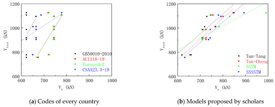 - The shear bearing capacity of reinforced concrete deep-beam specimens was calculated by using the calculation method recommended by the specification and the Tan–Tang model, Tan–Cheng model, SSTM, and SSSTM based on the strut-and-tie model. The results showed that the ACI318-19 code was similar to the test results, and the Chinese code has a greater safety reserve. The model proposed by Professor Tan takes into account the size effect and the data deviation was small. The calculation results of the softened strut-and-tie model method were close to the experimental results. The softened strut-and-tie model considers the softening effect of the concrete strut bar, and has a clear mechanical calculation model, which can reasonably reflect the stress mechanism of the components.