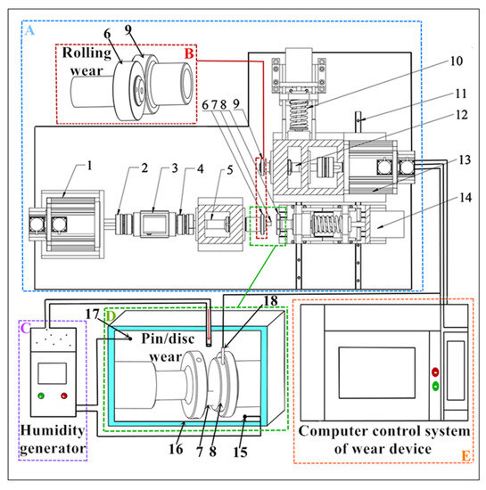 Figure 3 is the schematic diagram of the friction testing equipment used in this paper. The friction testing equipment includes a multifunctional friction test machine (A) (Shandong Province, China) and a humidity generator (C). Among them, (A) includes three parts: (B), (D) and (E). During the test, (1) drives (2) rotates, and the torque is monitored by (3). At the same time, the test force is monitored by (4). And (5) transmits motion and force to (6) and (7). In addition, (8) and (9) are located to the right of (A). They change position at (10) and (11) and transmit force and motion through (12) and (13). And the function of (14) is to move the specimen and bring it into contact to perform the wear test. Additionally, (15) is a sensor of (C) that monitors the humidity at the bottom of (D), while (16) is used to prevent heat loss. Moreover, (17) is another sensor of (C), which is used to monitor humidity at the top of (D). And (18) is a sensor used to measure the temperature value on the disc surface. Meanwhile, the braking speeds, test force, loading speeds, and other parameters required by the test are set using (E). At the same time, the test data in the testing process are fed back to the screen of (E) in real-time. And after reaching the test time, (C) should be turned off first. Then, the test force should be unloaded through (E). When the brake disc sample and brake pin sample are removed, the power supply should be turned off.