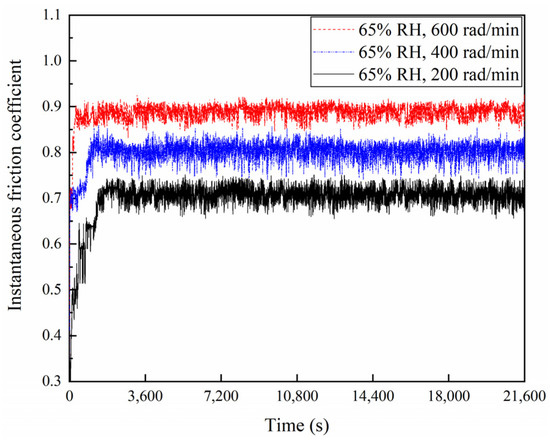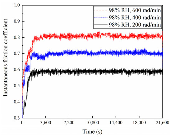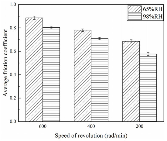 The friction coefficients of the braking materials for a variety of braking speeds at 65% RH and 98% RH are displayed in Figure 4, Figure 5 and Figure 6. At 65% RH, the friction coefficients of the braking materials for 600, 400, and 200 rad/min all displayed a rapid increase in the first 1800 s. But it rose the fastest at 600 rad/min, where the slope of the curve is greatest. After 3600 s, these instantaneous friction coefficients gradually became stable and exhibited a slow change. The instantaneous friction coefficient at 65% RH, 600 rad/min, was the largest, followed by 65% RH, 400 rad/min, and the smallest was at 65% RH and 200 rad/min. Moreover, at 98% RH, the friction coefficients increased quickly during the first 1800 s. The friction coefficients showed a slow increase at 600 and 200 rad/min after 1800 s. It displayed a decrease at 400 rad/min. After 3600 s, these instantaneous friction coefficients showed a slow change and gradually became stable. However, the instantaneous friction coefficient was the largest at 98% RH, 600 rad/min, and the smallest at 98% RH, 200 rad/min. In addition, Figure 6 shows the average friction coefficients of the braking material in a range of humidity conditions and a variety of braking speeds. At 65% RH and 98% RH, as the braking speeds decreased from 600 to 400 and then to 200 rad/min, the average friction coefficients diminished successively. At 65% RH, the average friction coefficient at 600 rad/min was 0.89; at 400 rad/min it was 0.78; at 200 rad/min, it was 0.69. But under 98% RH conditions at 600 rad/min it was 0.8; at 400 rad/min, it was 0.71; and at 200 rad/min, it was 0.58.