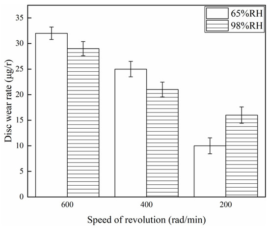 Figure 7 and Figure 8 show the wear rate of the brake disc and brake pin for a variety of braking speeds at 65% RH and 98% RH. It is not difficult to find from Figure 7 that when ambient humidities were the same, the wear rate of the disc declined with a reduction in the braking speeds. Under certain braking speed conditions, the wear rate of the brake disc at 98% RH was smaller than that at 65% RH, under 600 and 400 rad/min conditions. But, at 200 rad/min, the wear rate of the brake disc at 98% RH was larger compared to that at 65% RH. Concretely, under 65% RH conditions, the wear rate of the brake disc at 200 rad/min was 10 µg/r, and at 600 rad/min was 32 µg/r. But at 98% RH, the wear rate at 200 rad/min was 16 µg/r, and at 600 rad/min was 29 µg/r. The wear rate of the brake disc was highest at 65% RH, 600 rad/min. And at 65% RH, 200 rad/min was the smallest. Figure 8 shows the wear rate of the brake pin for a variety of braking speeds at 65% RH and 98% RH. The wear rate of the brake pin was much greater than that of the brake disc under the same ambient humidities and braking speed conditions. In addition, under 65% RH conditions, the wear rate of the brake pin at 200 rad/min was 22 µg/r, and at 600 rad/min was 63 µg/r. But at 98% RH, the wear rate at 200 rad/min was 36 µg/r, and at 600 rad/min was 59 µg/r.