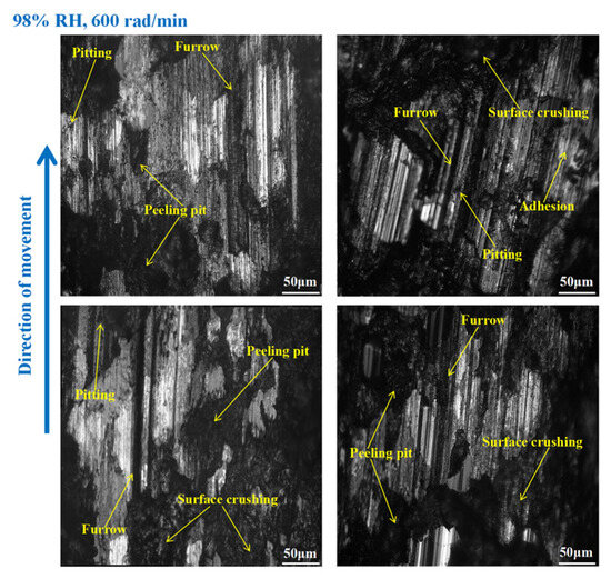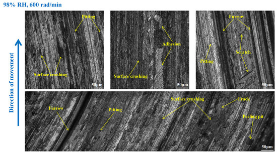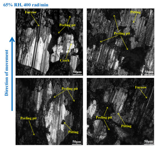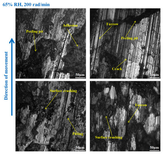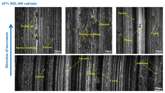 It is obvious from Figure 9 that the wear of the brake disc was serious at 65% RH, 600 rad/min. Pitting, peeling pits, and furrows were identified on the disc surface. In addition, there were cracks, abrasive damage, and adhesion damage around the furrows. At the same time, some heavily worn areas had been crushed. Compared with Figure 9, the surface damage of the brake disc in Figure 10 appears reduced. Specifically, the amount of pitting on the disc surface was diminished, and there were no obvious peeling pits. However, there were still furrows, pitting, capillary cracks, abrasive particles, and adhesion damage on the disc’s surface. In addition, from Figure 11, it is not difficult to find that the surface of the brake disc was smoother than that in Figure 10, and the furrows, pitting, adhesion damage, and abrasive damage were attenuated. The areas of the disc surface that were crushed were reduced.
