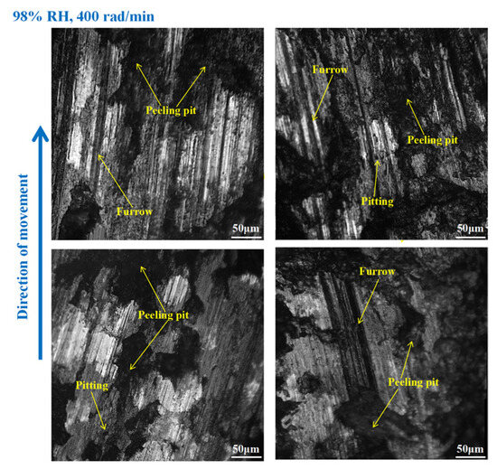 Considering both braking speed and ambient humidity comprehensively, the wear rate to the braking materials at 98% RH is smaller than that at 65% RH, under 600 and 400 rad/min conditions. But, at 200 rad/min, the wear rate to the braking materials at 98% RH is larger compared to that at 65% RH. Concretely, at 98% RH, compared with 65% RH, the wear rate to the brake disc increases by about 39% and increases by about 37% of the brake pin. The reason for this is that at high braking speeds, the water droplets on the brake disc surface are easily thrown out, and their stay time is short. Meanwhile, as the braking speeds are great, the brake disc surface temperatures are also high. This high temperature can lead to increased wear to the braking materials. However, at 98% RH, 200 rad/min, numerous water droplets adhere to the disc surface. But, due to the slow braking speed, it is difficult to throw them out in a short time, and this exacerbates the surface fatigue damage to the braking materials [29].