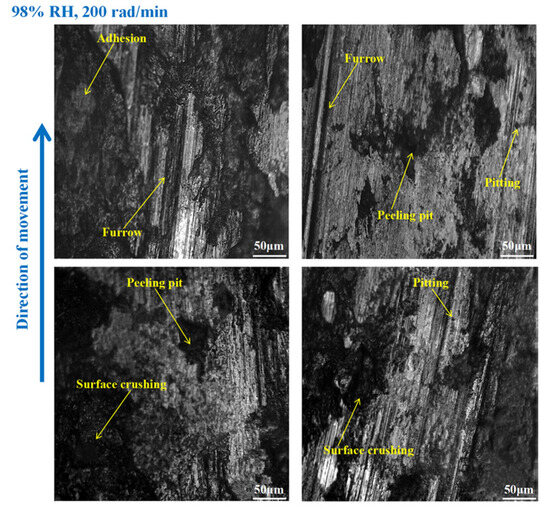 As shown in Figure 12, furrows, pitting, scratches, capillary cracks, peeling pits, adhesion damage, and abrasive damage existed on the disc surface. Meanwhile, some materials fell off from the disc’s surface. However, the wear damage to the disc at 98% RH, 600 rad/min was smaller than that under 65% RH, 600 rad/min, conditions. Compared to Figure 12, the surface damage of the disc in Figure 13 relatively decreased. The wear marks were mainly pitting, furrows, peeling pits, surface crushing, and adhesion damage. Obviously, the wear of the brake disc at 98% RH, 200 rad/min, was small, as shown in Figure 14. The number of furrows, pitting, and peeling pits on the disc surface was reductive. Moreover, the surface crushing and adhesion damage were reduced, and the overall wear was relatively slight.