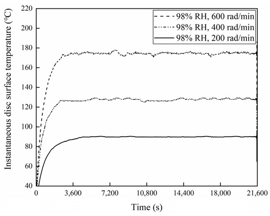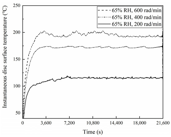 Figure 21, Figure 22 and Figure 23 exhibit the temperatures on the brake disc surface at a variety of braking speeds in a range of humidity conditions. As shown in Figure 21, when the ambient humidity was 65% RH, the instantaneous disc surface temperatures at 600 rad/min were greater than those at 400 rad/min and larger than those at 200 rad/min. In addition, when the braking speed was 600 rad/min, the disc surface–temperature curve fluctuated greatly before 14,400 s. But at 400 and 200 rad/min, the disc surface temperatures increased first and then became stable. And the temperature curve fluctuation was relatively small. Meanwhile, it is worth noting that as the braking speed was 200 rad/min, the temperatures changed little after 7400 s. Moreover, similar to Figure 21, it is clear from Figure 22 that when the ambient humidity was 98% RH, the disc surface temperatures declined with a reduction in the braking speed. However, significantly, the disc surface–temperature curves fluctuated less at 98% RH compared to that at 65% RH. Especially at 98% RH, 200 rad/min, the brake disc surface temperatures increased first and then became steady. After 7200 s, the disc surface temperatures almost remained unchanged. In addition, compared with Figure 21, it is not difficult to identify that at the same braking speeds, the instantaneous disc surface temperatures were lower at 98% RH than those under 65% RH conditions. Furthermore, Figure 23 displays the maximum disc surface temperatures under a variety of braking speed conditions in a range of humidity conditions. It is evident that at the same ambient humidities, as the braking speed decreased, the maximum disc surface temperatures diminished. In addition, under certain braking speed conditions, the maximum disc surface temperature values were greater at 65% RH compared to that at 98% RH. Among them, under 65% RH conditions, the maximum temperature at 200 rad/min was 113.8 °C, and at 600 rad/min was 197.8 °C. But at 98% RH, the maximum disc surface temperature at 200 rad/min was 93.7 °C, and at 600 rad/min was 182.9 °C.