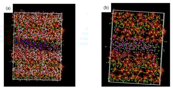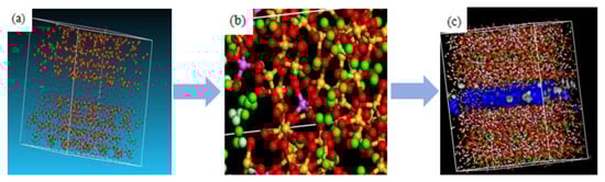 Erosion ions are added to the model to simulate the 3.5% Na2SO4 solution used in the 3.5% NaCl solution, as shown in Figure 3a,b, and the corresponding concentration of Cl− is 0.684 mol/L and SO42− was 0.280 mol/L. The interlayer distance in the model is set to 30 Å; the diffusion and adsorption of the ions into the interlayer of the C-A-S-H gel are simulated using the molecular dynamics method, and the physical adsorption of the eroded ions into the pores of the C-A-S-H gel is simulated using the COMPASS2 force field. The force field is based on ab initio calculations of atomic valence parameters and partial atomic charges. The van der Waals parameters are calculated by fitting the experimental data; the van der Waals interactions are computed using liquid molecular dynamics simulations [16], which can be used to model the physical adsorption problem in this study. The electrostatic interactions between molecules are calculated using the Ewald summation method, and the van der Waals forces between the molecules are calculated using the Leonard Johns interaction potential.