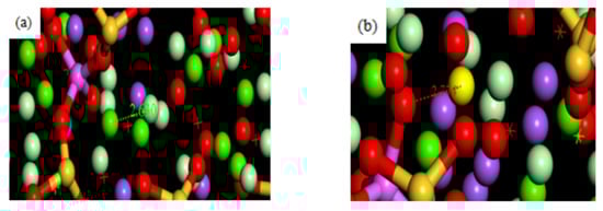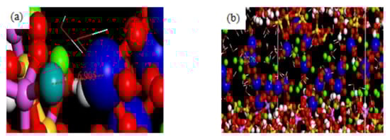 Figure 4a,b shows the bonding point between AlOCa+ and AlOH and Cl− after substitution by Al. As the positive charge of Al is less than that of silicon, the interlayer Coulomb effect is also reduced, so the bond length of Al-O (1.62 Å) is slightly greater than that of Si-O (1.56 Å). Due to this substitution effect, the bonding of AlOCa+ with AlOH and Cl− in the model will also change.