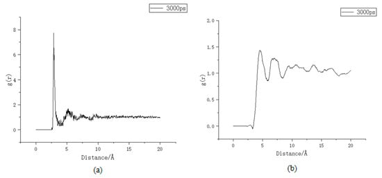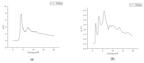 If the erosive ion is SO42−, the model also has the adsorption site for SO42−. Figure 6a shows the adsorption sites of C-A-S-H and SO42−. The substituted AlOH is still partially electrically neutral, it still cannot balance the positive charge carried by SO42−, and AlOCa+ can still bind stably to SO42− due to its positive charge. From a global perspective, in order to compensate for the missing charge after the substitution of Al in the global model, some Ca2+ cations are attracted to the surface of the C-A-S-H skeleton, forming a double electrical layer structure. It can be seen from Figure 6b that a large number of Ca2+ ions are enriched around the model at the Al substitution site. Some of the Ca2+ is adsorbed onto the surface of the C-A-S-H model. At this time, the positive ion charge on the surface of the model is increased and a double electrical layer structure is formed to bind SO42− more effectively. Figure 7a,b shows the RDF diagram between AlOCa+ and AlOH and SO42−.